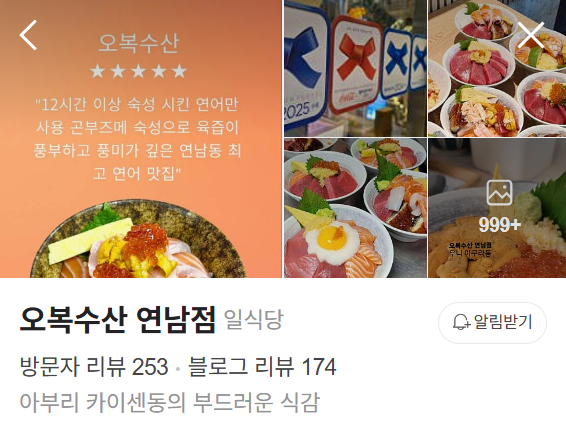 | 오복수산 | 카이센동, 우니동 | 신선한 해산물이 듬뿍 올라간 일본식 덮밥, 비주얼과 맛 모두 훌륭 |
