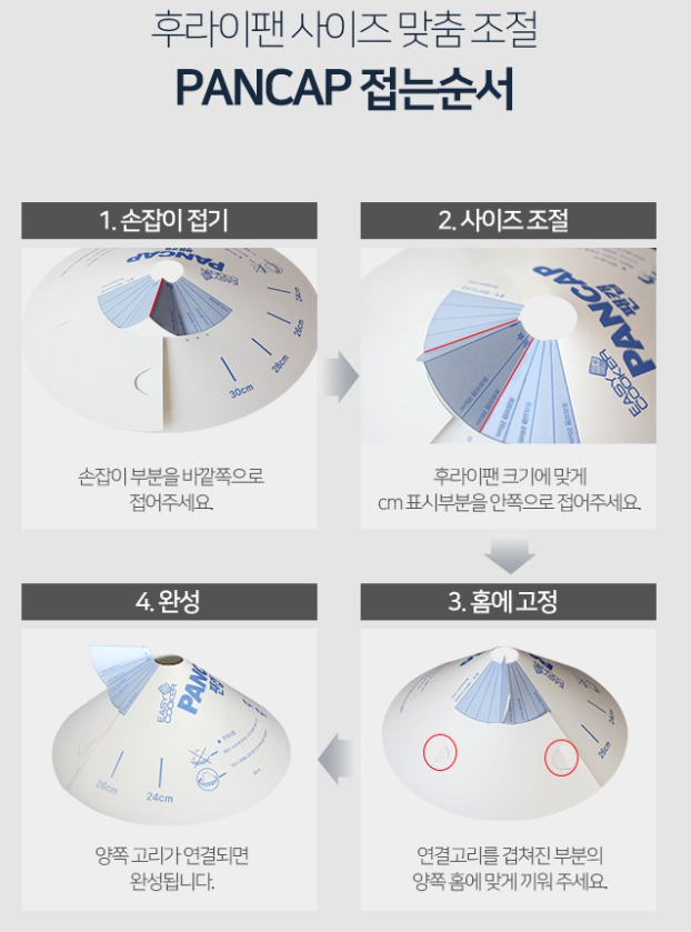 팬캡의 가장 큰 장점은 바로 사이즈 조절이 가능하다는 점이에요! 20cm~30cm 크기의 프라이팬에 모두 사용할 수 있어서 정말 편리합니다.