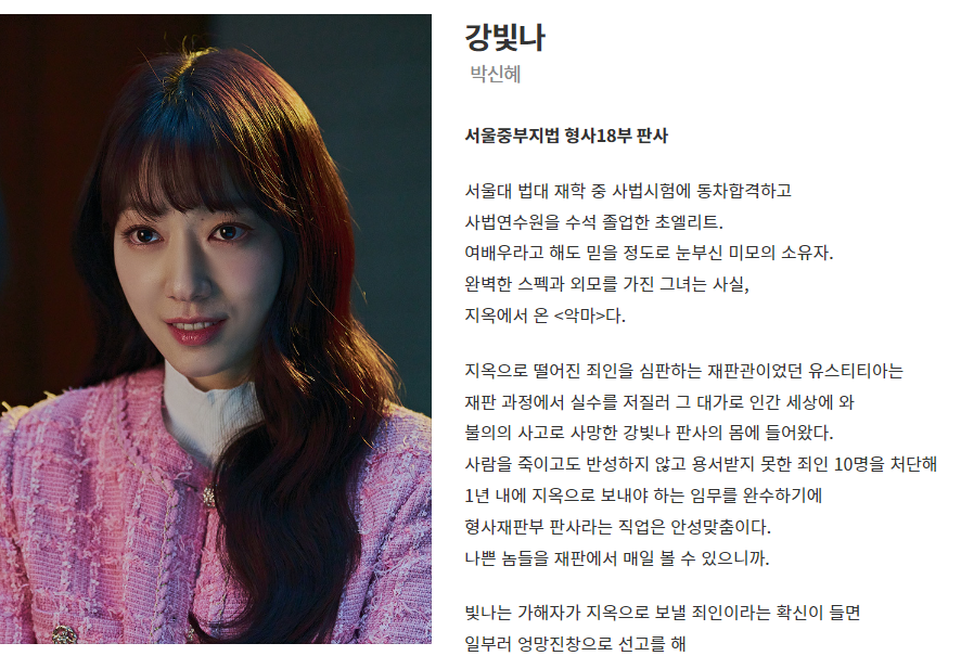 - 강빛나 (박신혜 분): 지옥에서 온 악마로, 서울대 법대를 수석 졸업한 엘리트 판사입니다. 그녀는 지옥의 재판관 유스티티아가 빙의된 상태로, 인간 세상에서 죄인들을 처단합니다. 빛나는 냉철하고 이성적인 성격을 가지고 있지만, 점차 인간적인 감정을 느끼게 됩니다.
