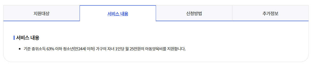 - ✔️ 자녀 1인당 매월 25만원의 아동양육비를 현금으로 지원받을 수 있습니다.