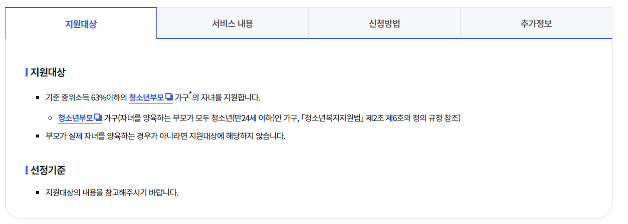 - ✔️ 만 24세 이하, 기준 중위소득 63% 이하인 청소년부모 가구가 지원 대상입니다.