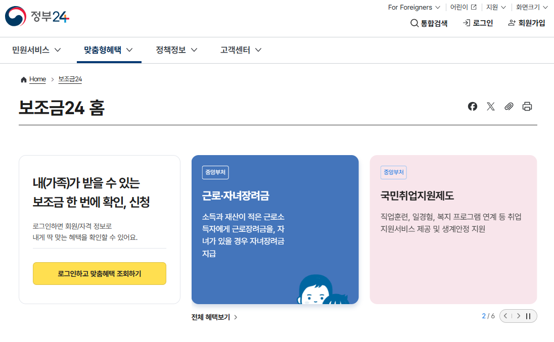 내가 받을 수 있는 모든 정부 혜택을 한 번에 확인하고 싶다면 아래 '보조금24' 사이트를 활용해 보세요. 간단한 정보 입력만으로 놓치고 있던 지원금을 찾을 수 있습니다.