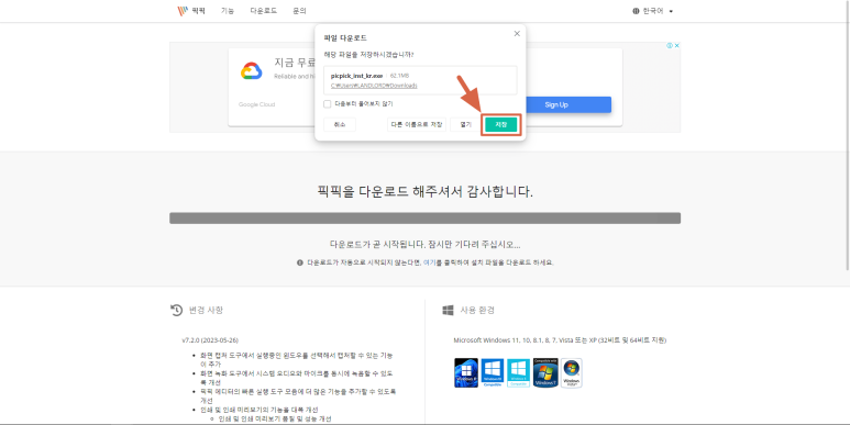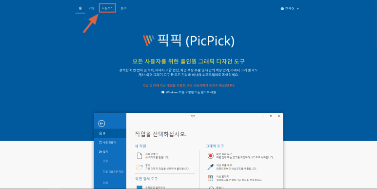 1. 픽픽 사이트(https://picpick.app/ko/) 접속 및 실행파일 다운로드