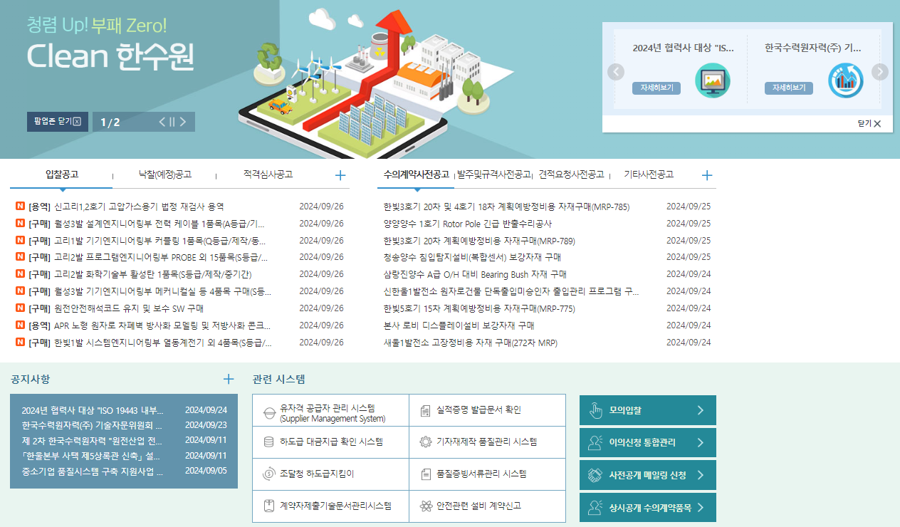 한수원의 입찰공고를 확인하거나 용역이나 구매 계약을 체결하기 위해서는 필수로 가입해야하는 사이트인데요.