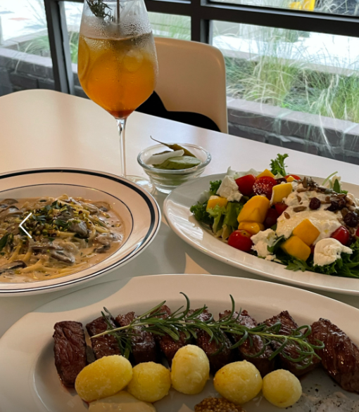 시그니처 A세트를 주문하면 스테이크와 파스타를 함께 즐길 수 있어요. 스테이크는 육즙이나 수분 손실 없이 정말 맛있게 구워져 나와요. 그냥 먹어도 맛있고, 소스를 찍어 먹어도 맛있어요.