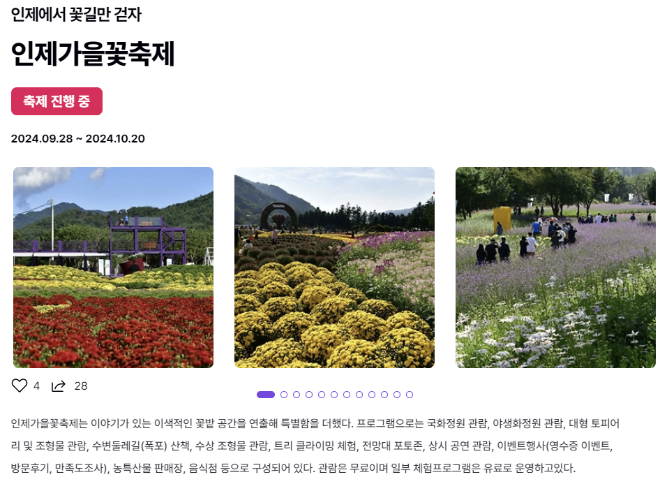 - 인제 가을 꽃축제 : 2024년 10월 1일 ~ 10월 15일