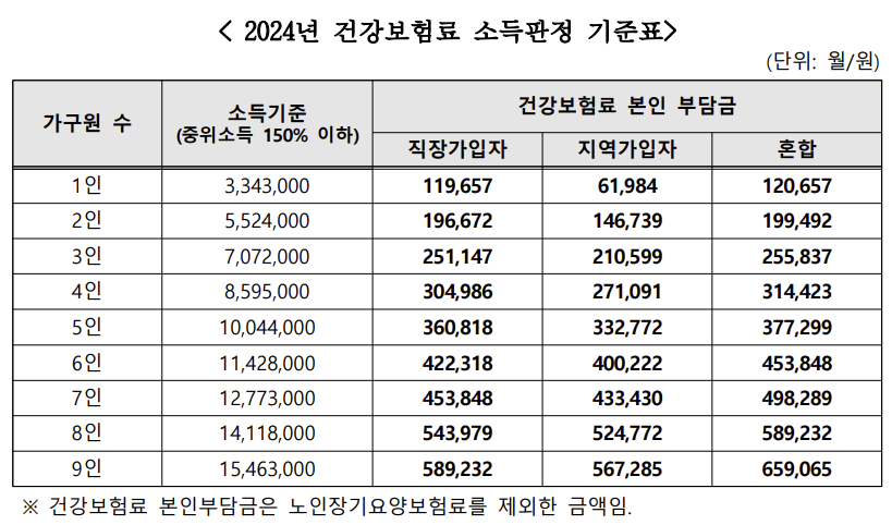 - 소득 요건: 기준 중위소득 150% 이하 (2024년 7월분 건강보험료 기준)