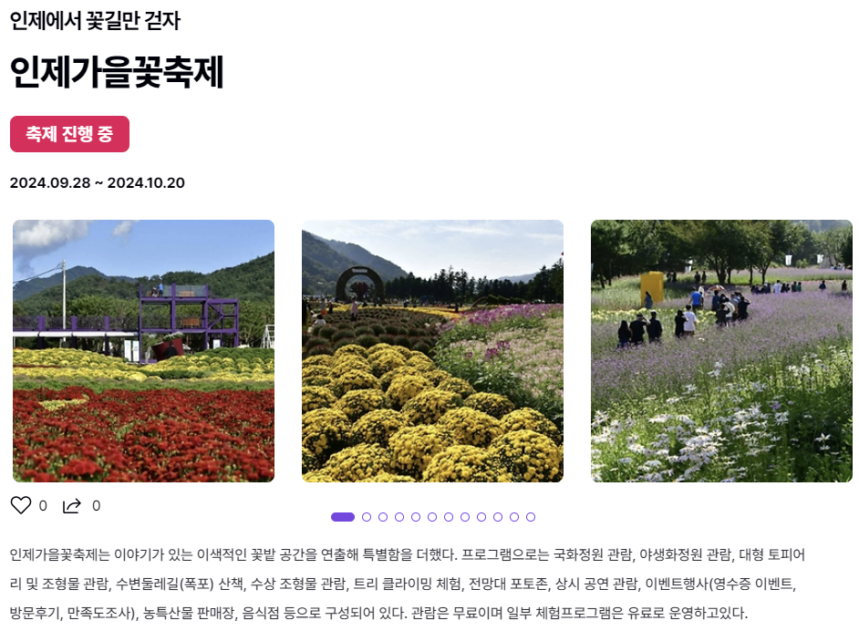 - 주요 내용: 인제 가을꽃축제는 이색적인 꽃밭 공간을 연출해 더욱 특별한 경험을 제공합니다. 주요 프로그램으로는 국화정원과 야생화정원 관람, 대형 토피어리 및 조형물 관람, 수변 조경을 포함한 다양한 자연 체험이 포함되어 있습니다.