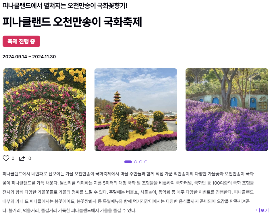 - 주요 내용: 피나클랜드 국화축제는 가을 국화와 다양한 꽃 조형물을 감상할 수 있는 축제로, 자연의 아름다움을 온몸으로 느낄 수 있습니다. 국화향이 가득한 수목원에서 가을의 정취를 즐겨보세요.