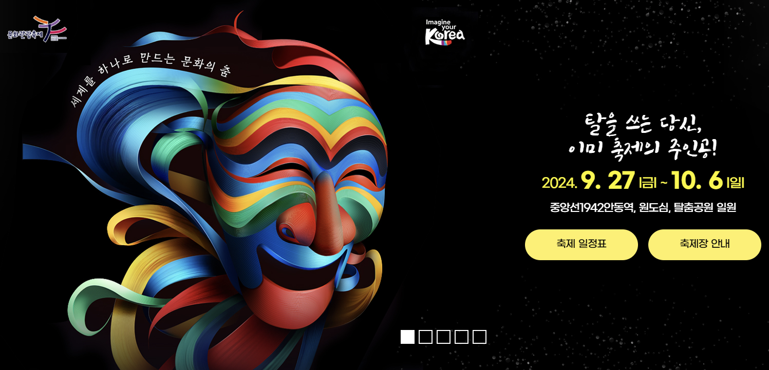 - 주요 내용: 안동 국제 탈춤 페스티벌은 전 세계 탈춤 문화를 소개하는 국제 축제로, 전통과 현대가 조화를 이루는 다양한 공연이 펼쳐집니다. 세계 각국의 탈춤을 감상하며 안동의 전통문화를 체험할 수 있습니다.
