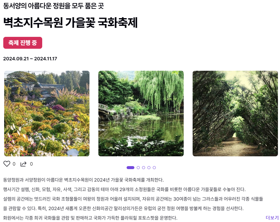 - 주요 내용: 벽초지수목원에서 열리는 국화축제는 다양한 국화꽃과 함께 소정원들이 꾸며진 아름다운 축제입니다. 가을의 끝자락까지 이어지는 이 축제는 가을꽃을 사랑하는 이들에게 완벽한 선택입니다.