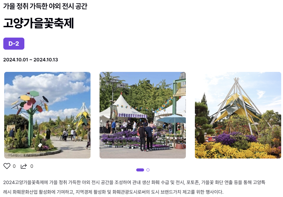 - 주요 내용: 고양시의 대표적인 가을꽃 축제인 고양 가을꽃축제는 일산호수공원에서 열립니다. 가을꽃들이 가득한 호수공원에서 산책하며 가을의 아름다움을 만끽해보세요.