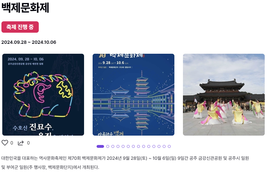 - 주요 내용: 백제문화제는 한국의 역사와 문화를 한눈에 볼 수 있는 대표적인 전통 축제입니다. 2024년에는 제70회를 맞이하여 더욱 다채로운 행사와 공연이 준비되어 있으며, 공주와 부여의 다양한 유적지를 배경으로 역사와 문화의 매력을 느낄 수 있습니다.