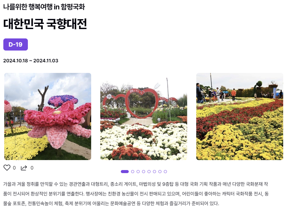 - 주요 내용: 가을과 겨울의 정취를 만끽할 수 있는 함평 국향대전은 대형 국화 기획 작품을 중심으로 다양한 국화 분재 작품을 전시합니다. 행사장에는 경관 연출과 함께 친환경 농산물이 전시 판매되며, 어린이를 위한 캐릭터 국화작품 전시와 동물숲 포토존 등도 마련되어 있습니다.