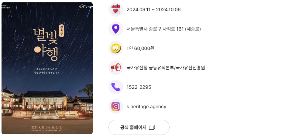 | 2024 경복궁 별빛야행: 잔여석 예매 방법과 행사 정보 총정리 (4) | 2024.10.01 |