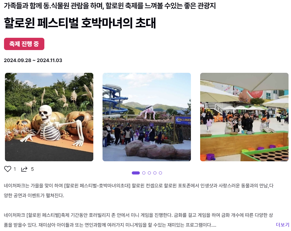 - 주요 내용: 가을을 맞이하여 열리는 네이처파크의 할로윈 페스티벌은 호박마녀의 초대를 주제로 진행됩니다. 할로윈 테마로 꾸며진 포토존에서 다양한 사진을 남기고, 사랑스러운 동물들과 교감할 수 있는 기회도 있습니다.