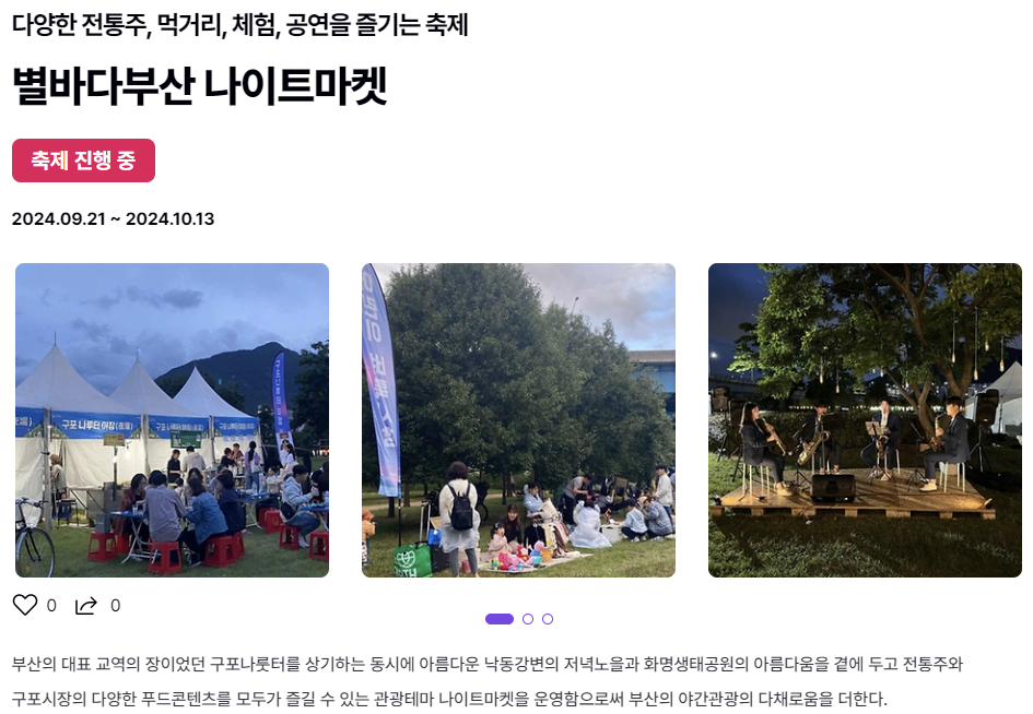 - 주요 내용: 부산의 저녁노을을 배경으로 열리는 별바다 나이트 마켓은 다양한 먹거리와 전통시장의 푸드 콘텐츠를 즐길 수 있는 행사입니다. 부산에서의 가을밤을 더욱 특별하게 만들어 줄 이 마켓은 지역 주민뿐 아니라 관광객들에게도 인기 있는 이벤트입니다.