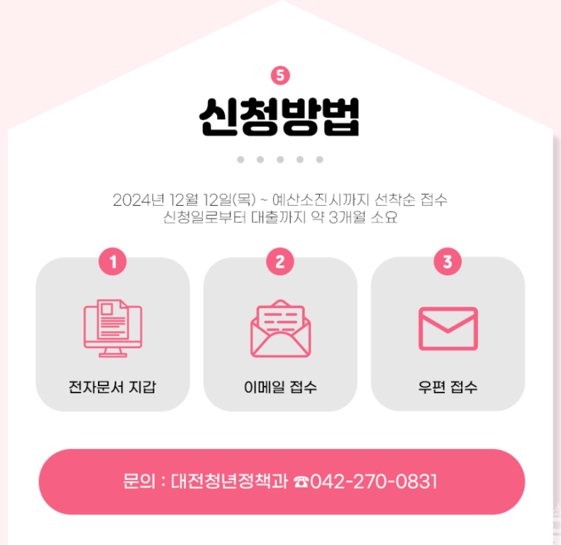 2024년 12월 12일부터 예산 소진 시까지 선착순으로 접수를 받고 있습니다. 신청 방법은 다음과 같이 세 가지가 있습니다.