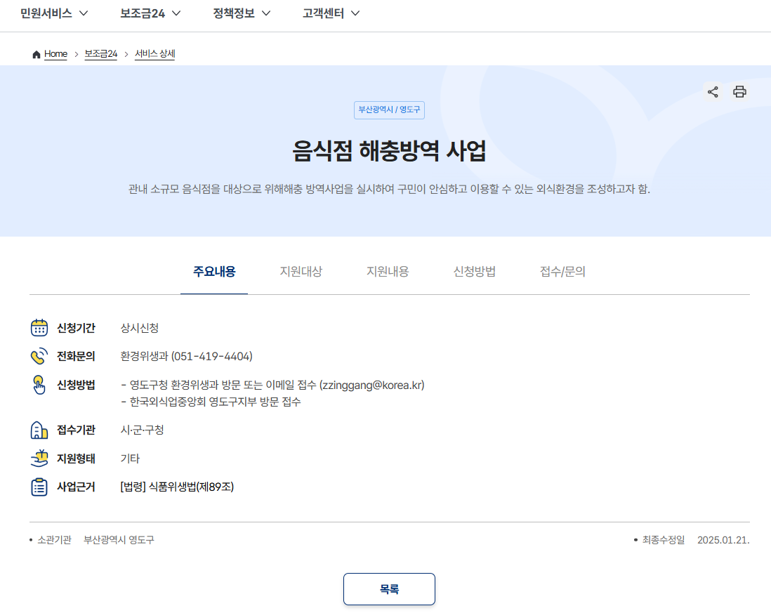 - 정부24 또는 보조금24에서 음식점 해충방역 사업 검색