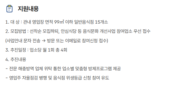 음식점 해충방역 사업은 지자체 또는 정부 지원을 통해 방역비 일부 또는 전액을 지원받을 수 있습니다. 신청은 정부24, 보조금24, 각 지자체 위생과에서 가능합니다.